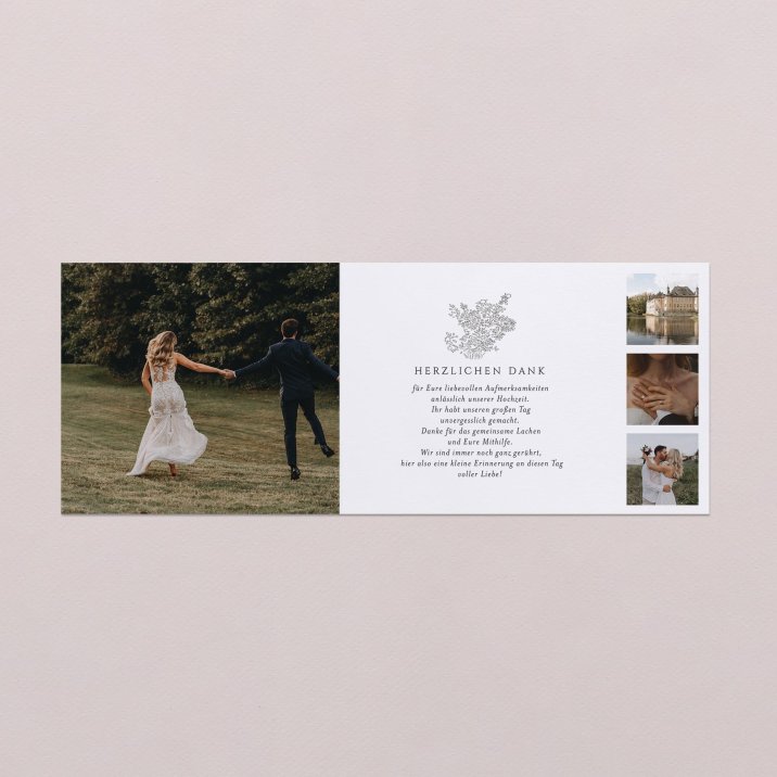 Bedanken Sie sich bei Ihrer Familie und Ihren Freunden mit dieser hübschen Dankeskarte zur Hochzeit. Die Karte im Querformat kann auf der Vorder- und Rückseite mit Ihrem Foto und Ihrer persönlichen Nachricht personalisiert werden. Ein zartes Geschenk als Erinnerung an diesen schönen Tag.