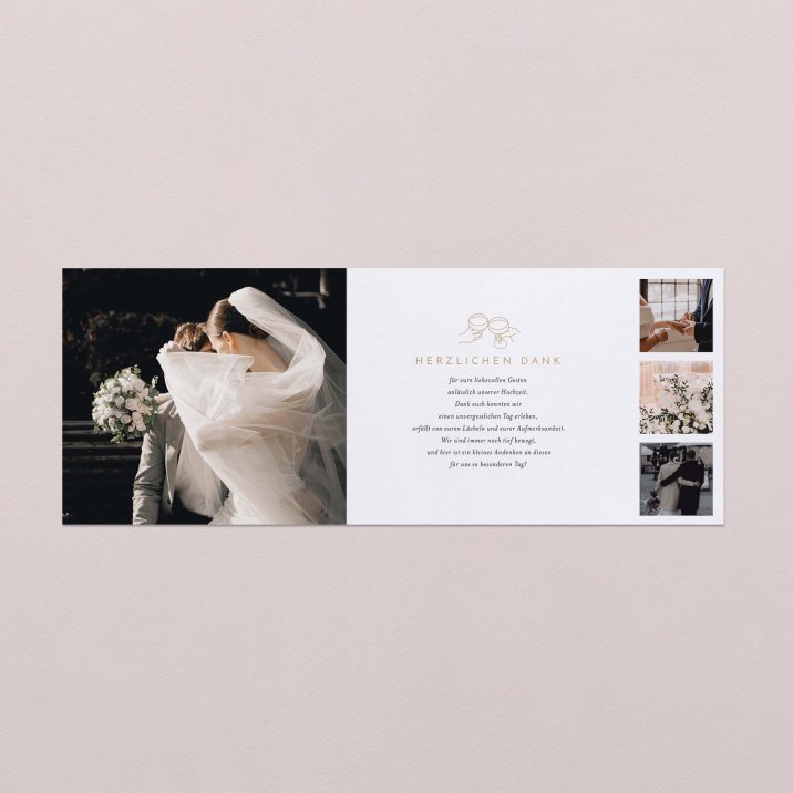 Bedanken Sie sich bei Ihrer Familie und Ihren Freunden mit dieser hübschen Dankeskarte zur Hochzeit. Die Karte im Querformat kann auf der Vorder- und Rückseite mit Ihrem Foto und Ihrer persönlichen Nachricht personalisiert werden. Ein zartes Geschenk als Erinnerung an diesen schönen Tag.