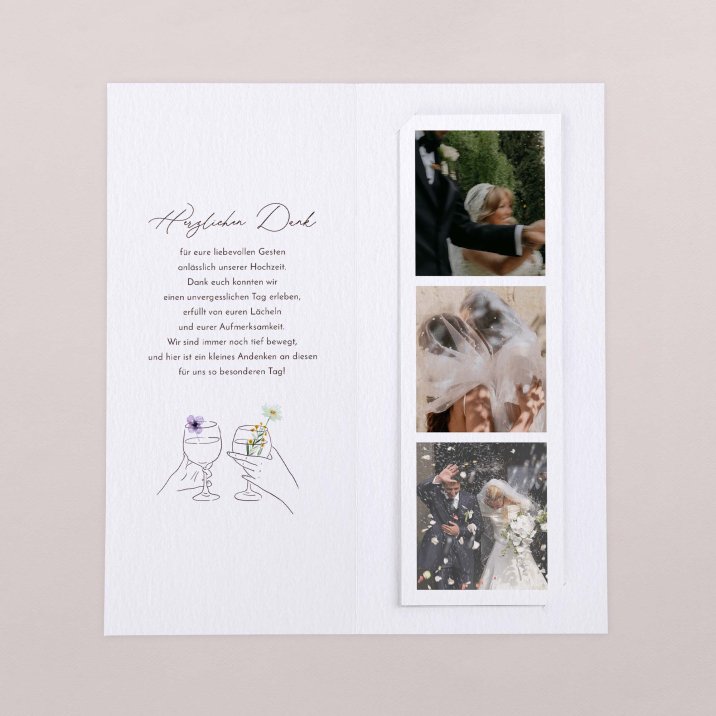 Diese Danksagung hat es in sich: die Klappkarte im Hochformat beinhaltet einen Fotostreifen mit Platz für 3 Ihrer schönsten Hochzeitsfotos.