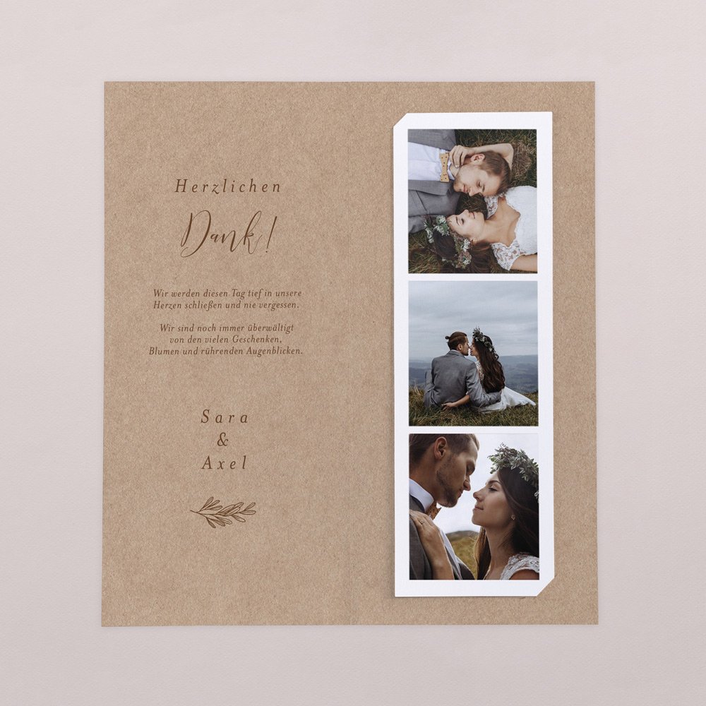 Diese Danksagung hat es in sich: die Klappkarte im Hochformat beinhaltet einen Fotostreifen mit Platz für 3 Ihrer schönsten Hochzeitsfotos.