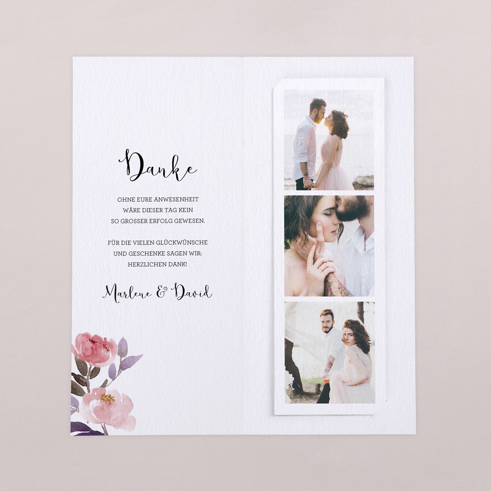 Diese Danksagung hat es in sich: die Klappkarte im Hochformat beinhaltet einen Fotostreifen mit Platz für 3 Ihrer schönsten Hochzeitsfotos.