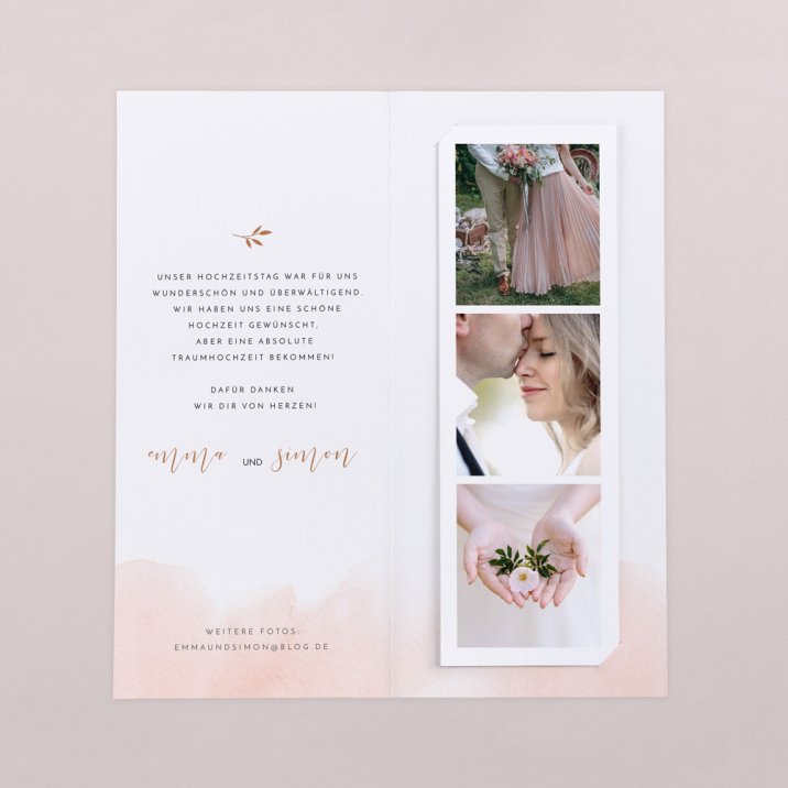 Diese Danksagung hat es in sich: die Klappkarte im Hochformat beinhaltet einen Fotostreifen mit Platz für 3 Ihrer schönsten Hochzeitsfotos.