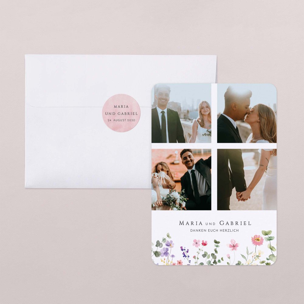 Gestalten Sie die Vorderseite mit Ihrem Text oder Ihren schönsten Hochzeitsfotos und die Rückseite mit Ihren persönlichen Dankesworten. Entdecken Sie auch die passenden Aufkleber zur Dankeskarte (siehe unten).