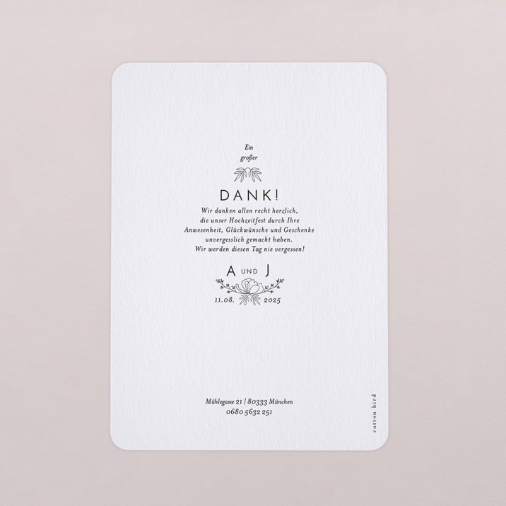 Eine große Karte für ein großes Dankeschön: Bedanken Sie sich bei Ihren Gästen für die Glückwünsche und Geschenke zur Hochzeit mit einer großformatigen Danksagungskarte.