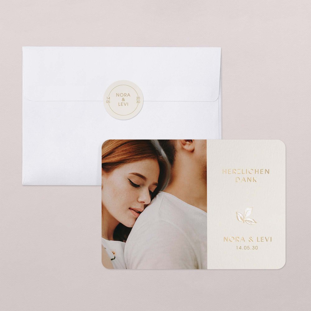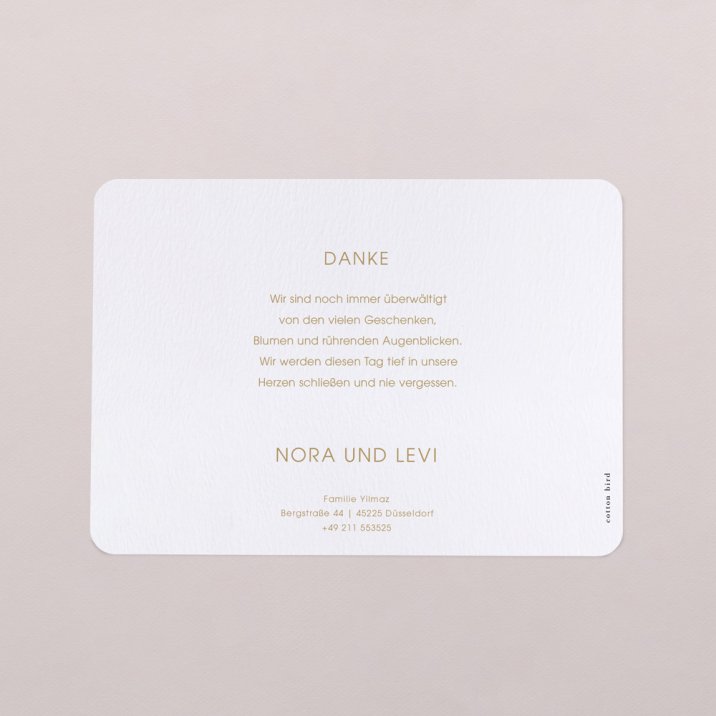Eine große Karte für ein großes Dankeschön: Bedanken Sie sich bei Ihren Gästen für die Glückwünsche und Geschenke zur Hochzeit mit einer großformatigen Danksagungskarte.
