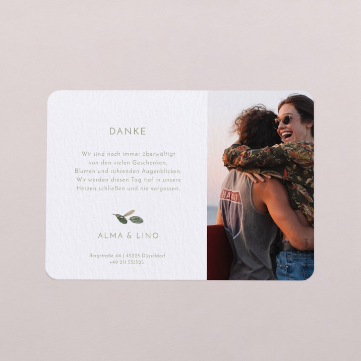 Eine große Karte für ein großes Dankeschön: Bedanken Sie sich bei Ihren Gästen für die Glückwünsche und Geschenke zur Hochzeit mit einer großformatigen Danksagungskarte.