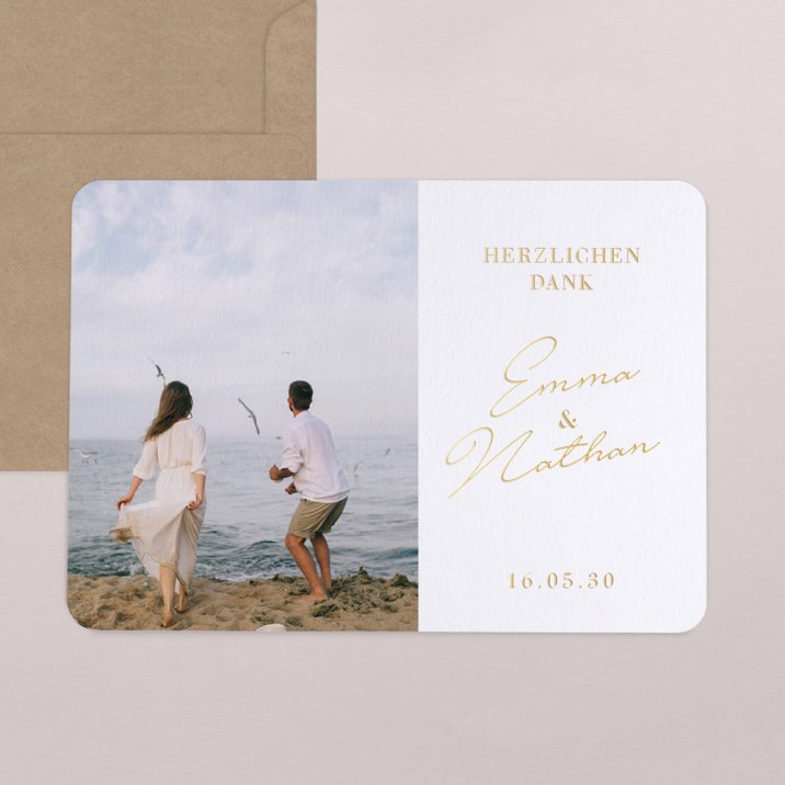 Eine große Karte für ein großes Dankeschön: Bedanken Sie sich bei Ihren Gästen für die Glückwünsche und Geschenke zur Hochzeit mit einer großformatigen Danksagungskarte.