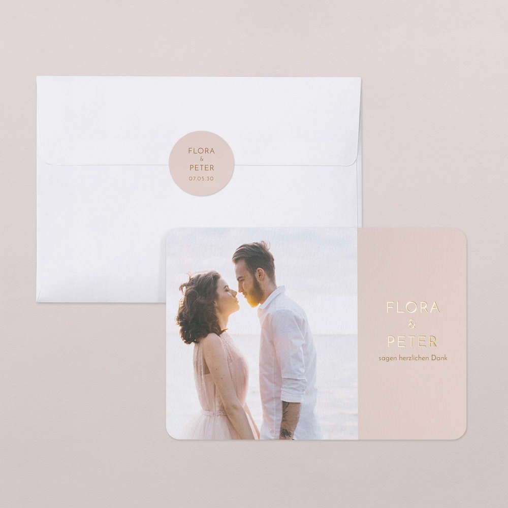 Eine große Karte für ein großes Dankeschön: Bedanken Sie sich bei Ihren Gästen für die Glückwünsche und Geschenke zur Hochzeit mit einer großformatigen Danksagungskarte.