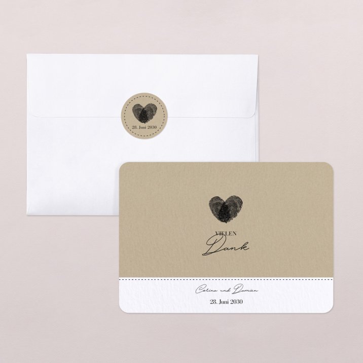 Gestalten Sie die Vorderseite mit Ihrem Text oder Ihren schönsten Hochzeitsfotos und die Rückseite mit Ihren persönlichen Dankesworten. Entdecken Sie auch die passenden Aufkleber zur Dankeskarte (siehe unten).