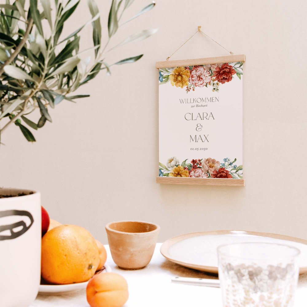 Unser Dekotipp: Für einen echten Blickfang empfehlen wir Ihnen, das Hochzeitsschild in einem Bilderrahmen mit Passepartout aufzustellen oder mit einem Posterhalter aufzuhängen. Ein kleiner Trick mit großer Wirkung!