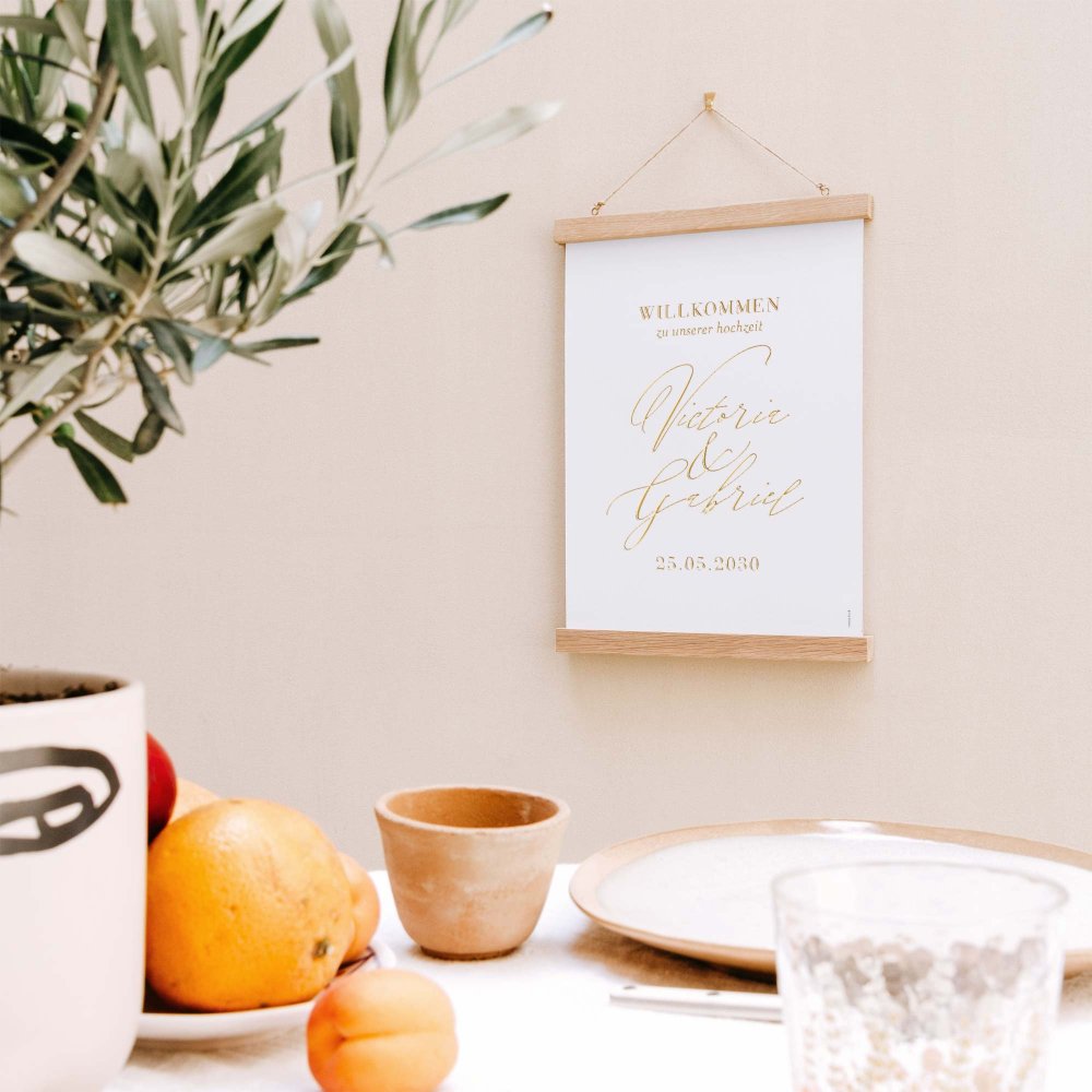 Unser Dekotipp: Für einen echten Blickfang empfehlen wir Ihnen, das Hochzeitsschild in einem Bilderrahmen mit Passepartout aufzustellen oder mit einem Posterhalter aufzuhängen. Ein kleiner Trick mit großer Wirkung!