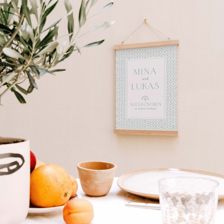 Unser Dekotipp: Für einen echten Blickfang empfehlen wir Ihnen, das Hochzeitsschild in einem Bilderrahmen mit Passepartout aufzustellen oder mit einem Posterhalter aufzuhängen. Ein kleiner Trick mit großer Wirkung!