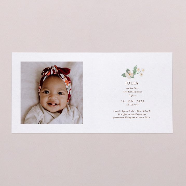Hübsche weiße Blumen schmücken die kleine Kapelle, in der Ihr Baby den Taufsegen erhalten wird. Die Taufkarte Kleine Kirche ist eine süße Einladung für Familie und Freunde, die Taufe Ihre Kindes gemeinsam zu feiern.