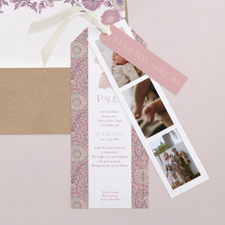 Diese originelle Taufeinladung besteht aus drei Elementen: einer doppelseitigen Karte in Form eines Etiketts, einem kleineren Etikett und einem Fotoautomaten.