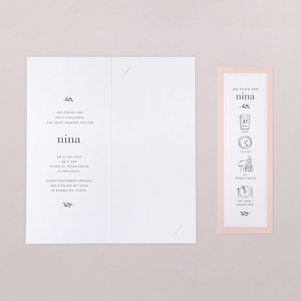 Eine originelle Taufeinladung, die alle wichtigen Informationen rund um den wundervollen Anlass mit kleinen Symbolen illustriert. Verlieben Sie sich in das zarte Design des Modells Kirsche und laden Sie Ihre Liebsten mit dieser Karte zur Taufe Ihrer Tochter ein.