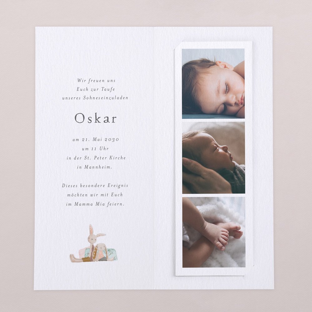 Das besondere Format dieser Taufeinladung wird Ihre Liebsten begeistern! Dieses Modell besteht aus einer hochformatige Klappkarte und einem Fotostreifen, der als Andenken aufbewahrt, an den Kühlschrank gepinnt oder als Lesezeichen benutzt werden kann.
