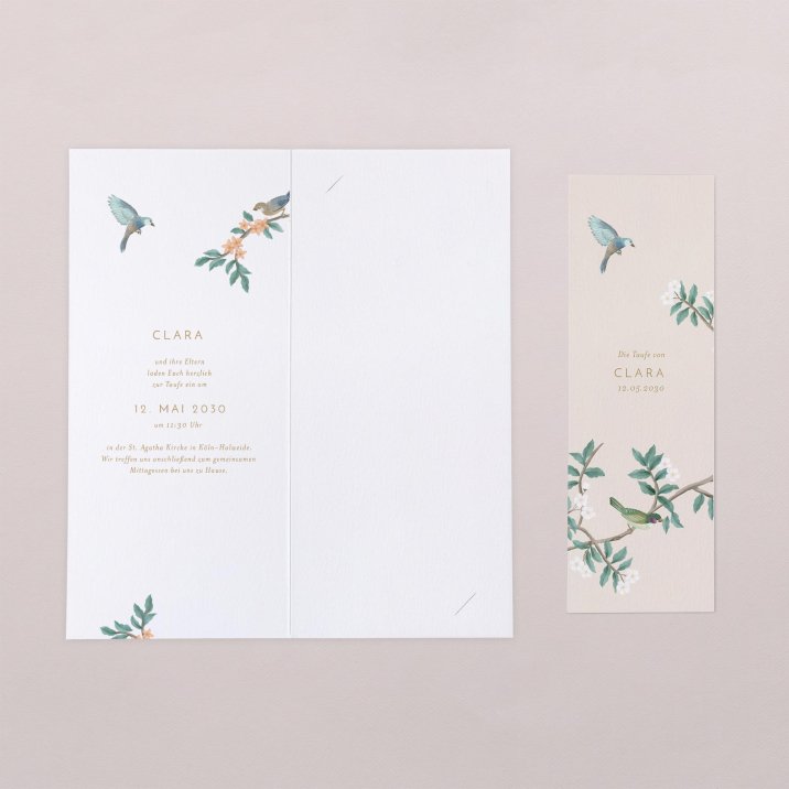 Die Taufeinladung Finken ist mit grünen Zweigen, weißen Jasminblüten und hübschen Vögeln in sanften Farben illustriert. Eingerahmt von diesem poetischen Motiv kommt Ihr Foto wunderbar zur Geltung. Kündigen Sie die Taufe Ihres Kindes mit dieser Einladungskarte liebevoll an Familie und Freunde an.
