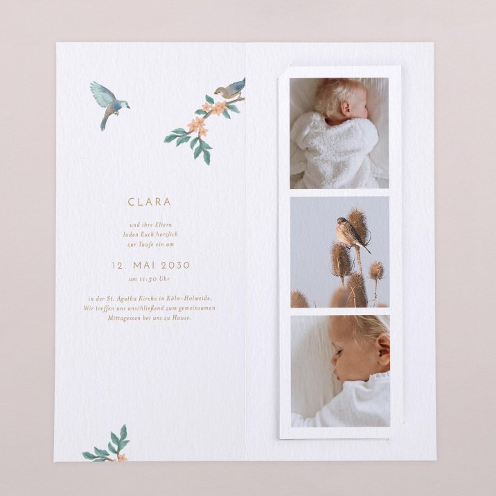 Das besondere Format dieser Taufeinladung wird Ihre Liebsten begeistern! Dieses Modell besteht aus einer hochformatige Klappkarte und einem Fotostreifen, der als Andenken aufbewahrt, an den Kühlschrank gepinnt oder als Lesezeichen benutzt werden kann.