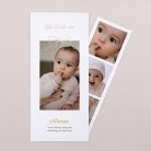 Das besondere Format dieser Taufeinladung wird Ihre Liebsten begeistern! Dieses Modell besteht aus einer hochformatige Klappkarte und einem Fotostreifen, der als Andenken aufbewahrt, an den Kühlschrank gepinnt oder als Lesezeichen benutzt werden kann.