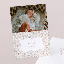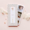 Diese Taufeinladung besteht aus einer in der Mitte gefalteten Karte und einem Fotostreifen, der in die Klappkarte eingelegt werden kann. Zwei Perforationen auf der Vorderseite bieten Platz für einen Trockenblumenzweig (zusätzlich wählbar). Damit Ihre Empfänger die ganze Pracht der Trockenblumen auf Ihren Einladungen genießen können, empfehlen wir die Einladungen persönlich überreichen. Jede Trockenblume ist einzigartig. Daher können ihr Aussehen, ihre Größe und ihre Farbe leicht von der hier gezeigten Abbildung abweichen.