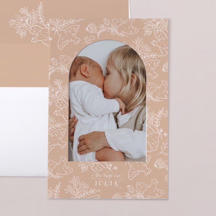 Elegante Tauben rahmen das Foto Ihres Kindes, das an diesem besonderen Tag im Mittelpunkt aller Aufmerksamkeit steht. Mit zartem Pastellrosa und einem raffinierten Fensterausschnitt ist die Taufkarte Ballet III eine ideale Wahl, um die Taufe Ihres Kindes anzukündigen.
