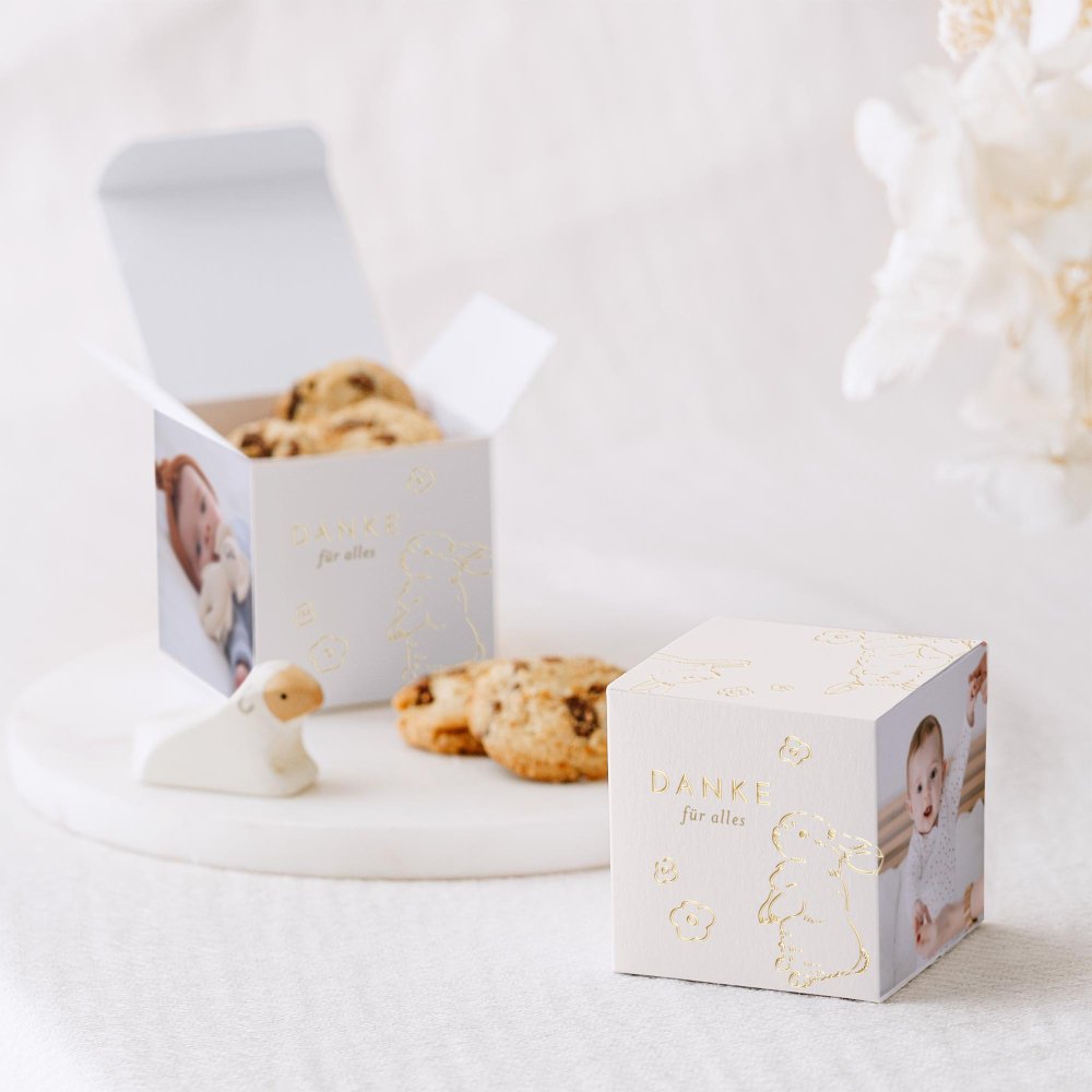 Gestalten Sie die Box mit dem Namen des Kindes, dem Datum der Tauffeier und einer kleinen Nachricht und sorgen Sie für Freude bei Ihren Liebsten.