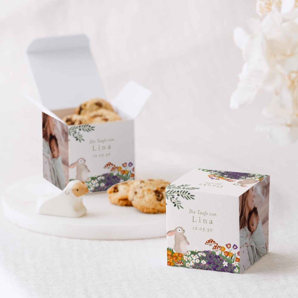 Gestalten Sie die Box mit dem Namen des Kindes, dem Datum der Tauffeier und einer kleinen Nachricht und sorgen Sie für Freude bei Ihren Liebsten.