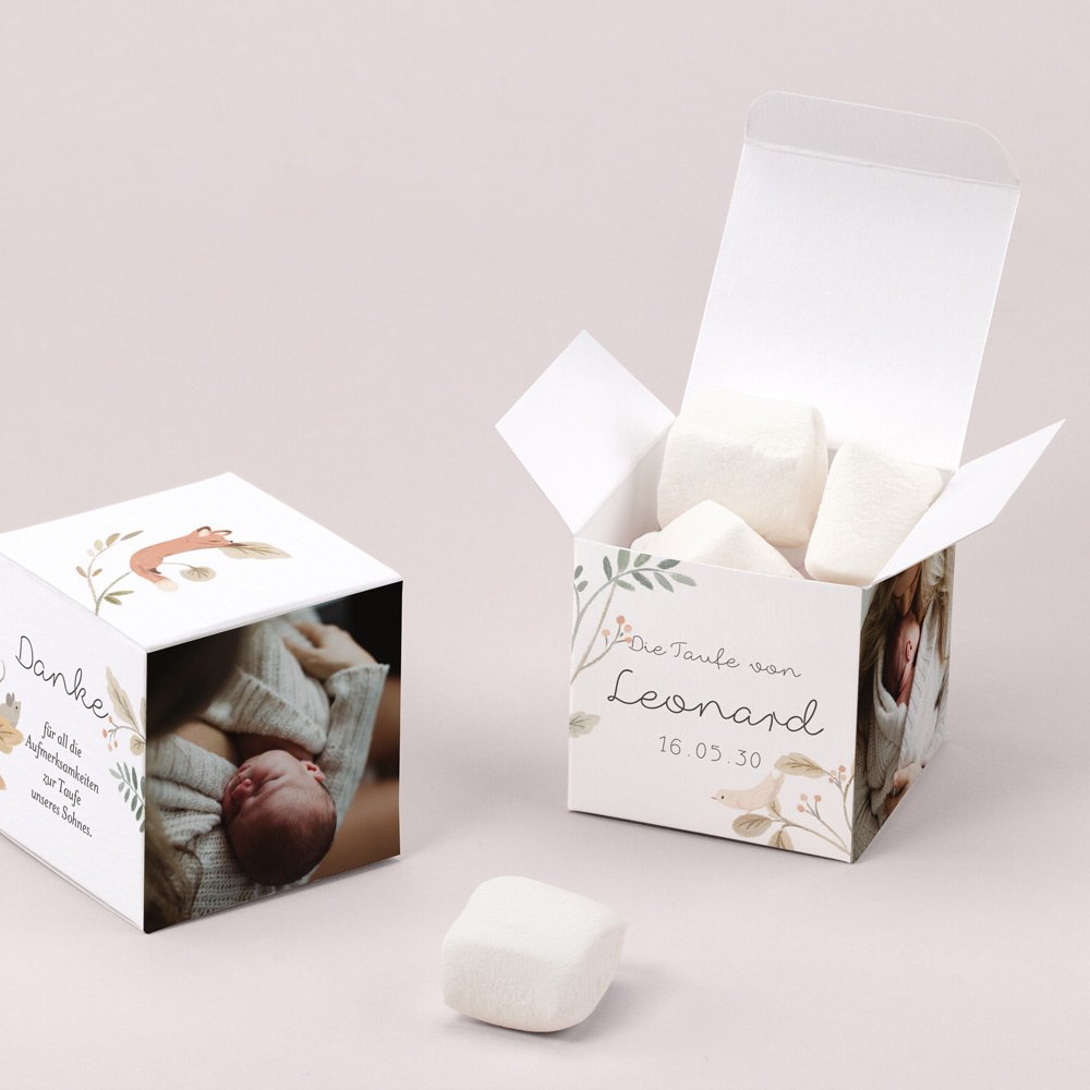 Gestalten Sie die Box mit dem Namen des Kindes, dem Datum der Tauffeier und einer kleinen Nachricht und sorgen Sie für Freude bei Ihren Liebsten.