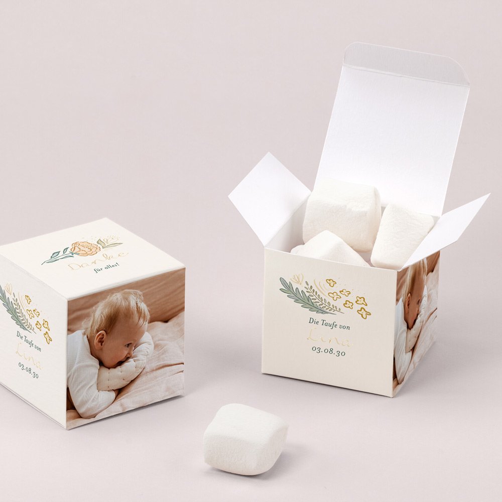 Gestalten Sie die Box mit dem Namen des Kindes, dem Datum der Tauffeier und einer kleinen Nachricht und sorgen Sie für Freude bei Ihren Liebsten.