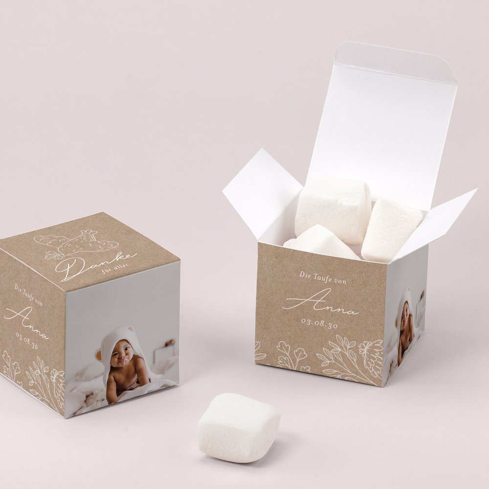 Gestalten Sie die Box mit dem Namen des Kindes, dem Datum der Tauffeier und einer kleinen Nachricht und sorgen Sie für Freude bei Ihren Liebsten.