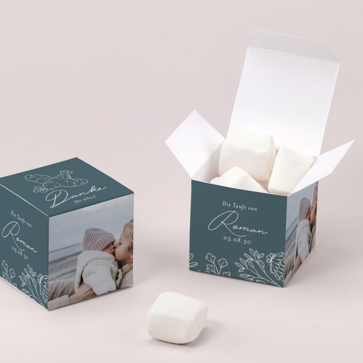 Gestalten Sie die Box mit dem Namen des Kindes, dem Datum der Tauffeier und einer kleinen Nachricht und sorgen Sie für Freude bei Ihren Liebsten.