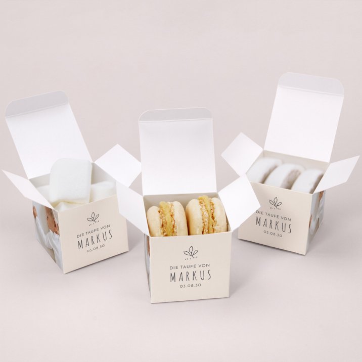 Gestalten Sie die Box mit dem Namen des Kindes, dem Datum der Tauffeier und einer kleinen Nachricht und sorgen Sie für Freude bei Ihren Liebsten.