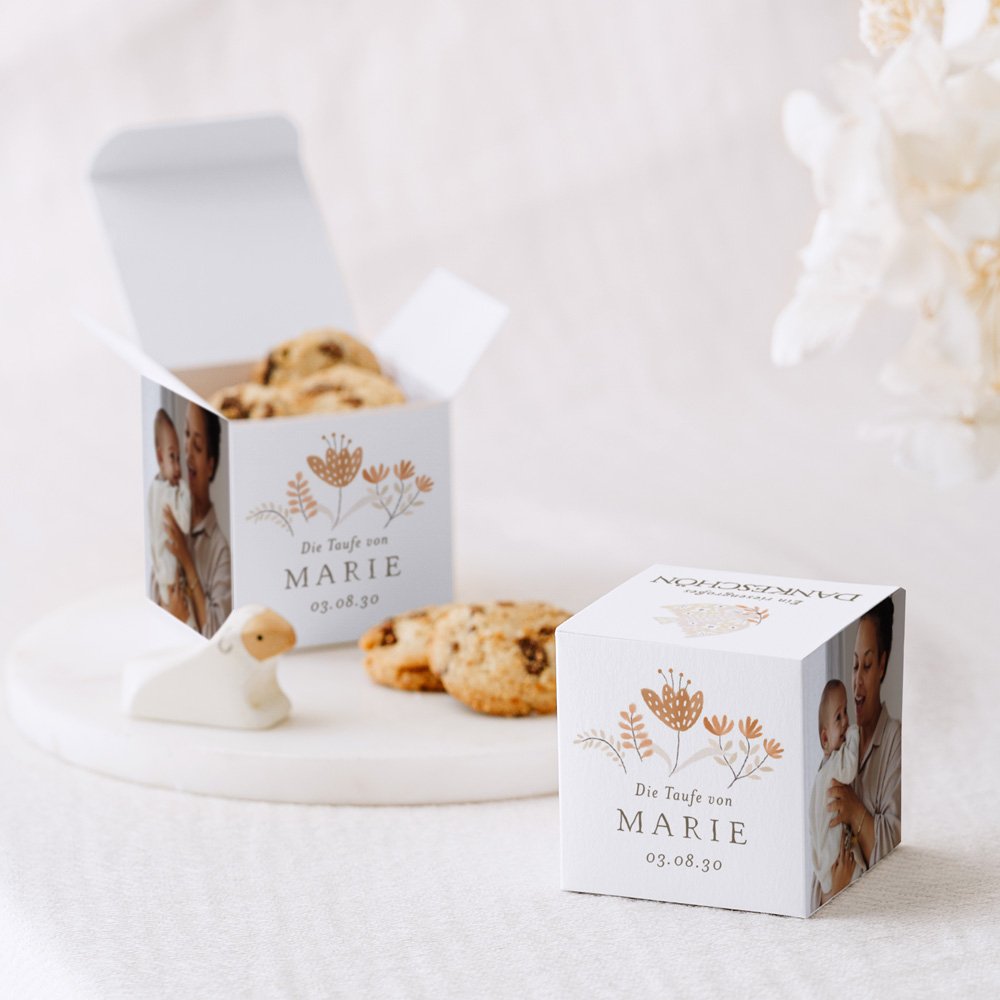 Gestalten Sie die Box mit dem Namen des Kindes, dem Datum der Tauffeier und einer kleinen Nachricht und sorgen Sie für Freude bei Ihren Liebsten.