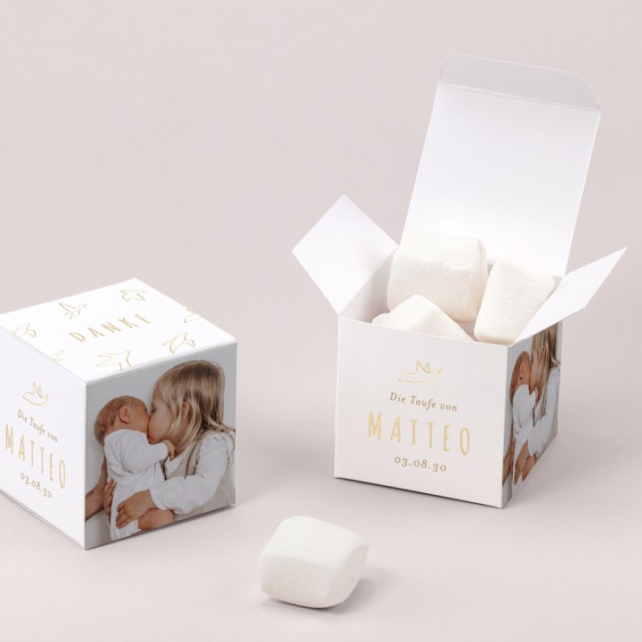 Gestalten Sie die Box mit dem Namen des Kindes, dem Datum der Tauffeier und einer kleinen Nachricht und sorgen Sie für Freude bei Ihren Liebsten.
