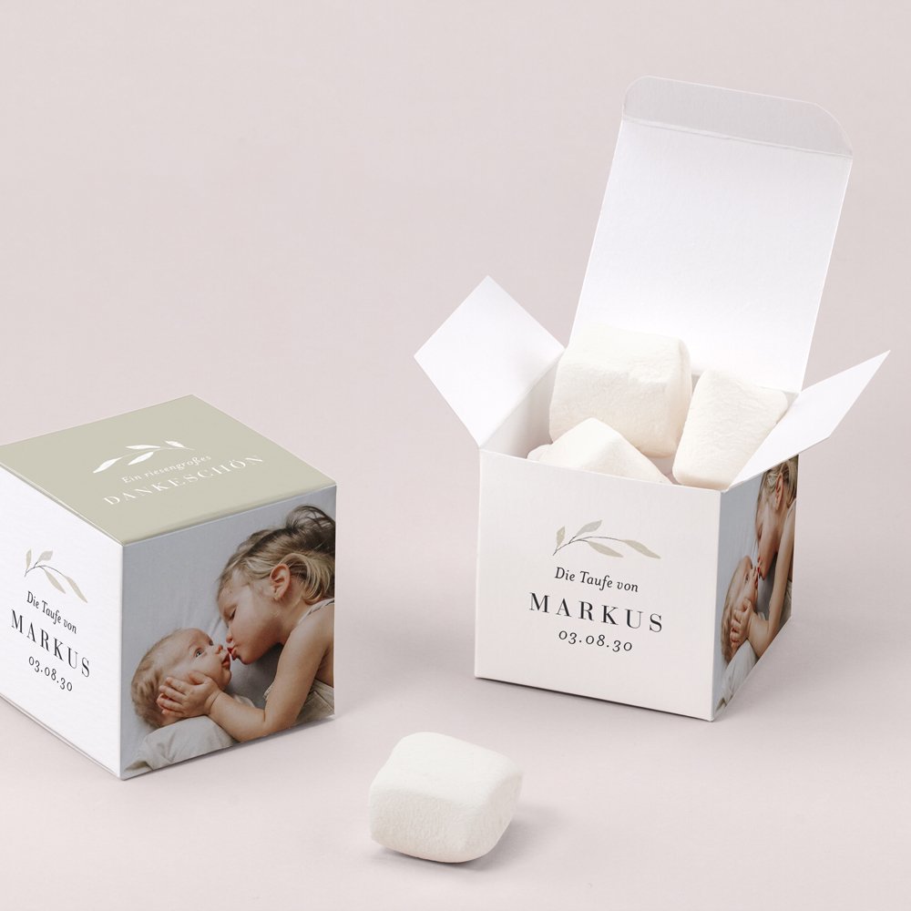 Gestalten Sie die Box mit dem Namen des Kindes, dem Datum der Tauffeier und einer kleinen Nachricht und sorgen Sie für Freude bei Ihren Liebsten.