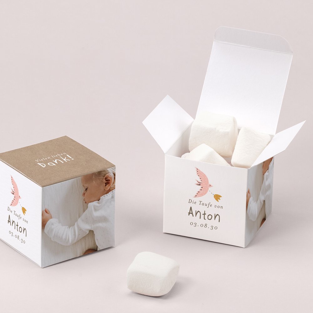 Gestalten Sie die Box mit dem Namen des Kindes, dem Datum der Tauffeier und einer kleinen Nachricht und sorgen Sie für Freude bei Ihren Liebsten.
