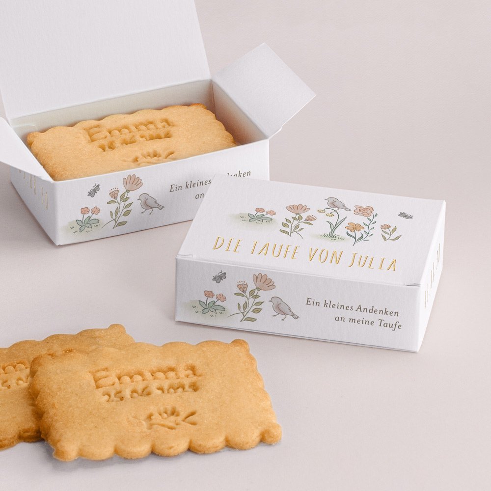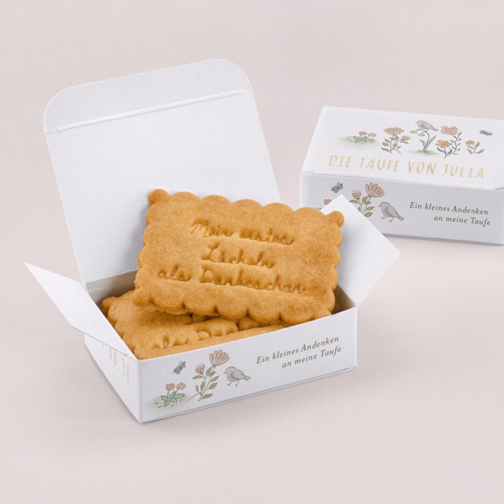 Die Keksbox ist die perfekte Verpackung für selbstgebackene Kekse oder andere Leckereien und eine ideale kleine Aufmerksamkeit für Ihre Taufgäste. Sagen Sie Familie und Freunden auf ganz besondere Art und Weise Dankeschön für die Glückwünsche und Geschenke, die Ihr Kind zur Taufe erhalten hat.