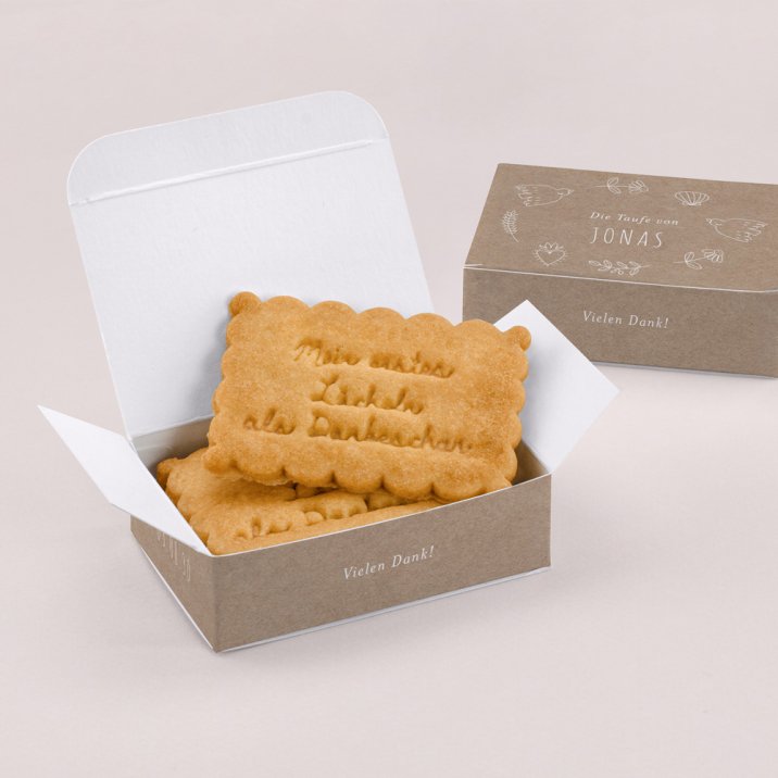 Die Keksbox ist die perfekte Verpackung für selbstgebackene Kekse oder andere Leckereien und eine ideale kleine Aufmerksamkeit für Ihre Taufgäste. Sagen Sie Familie und Freunden auf ganz besondere Art und Weise Dankeschön für die Glückwünsche und Geschenke, die Ihr Kind zur Taufe erhalten hat.