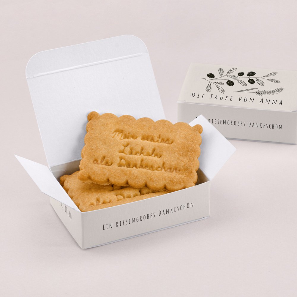 Die Keksbox ist die perfekte Verpackung für selbstgebackene Kekse oder andere Leckereien und eine ideale kleine Aufmerksamkeit für Ihre Taufgäste. Sagen Sie Familie und Freunden auf ganz besondere Art und Weise Dankeschön für die Glückwünsche und Geschenke, die Ihr Kind zur Taufe erhalten hat.