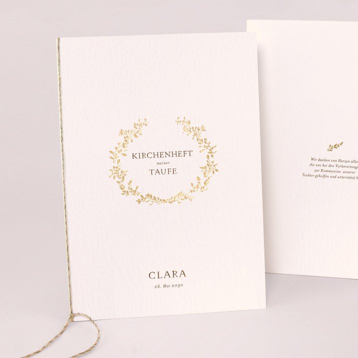 Fassen Sie die schönen Worte dieses feierlichen Anlasses in einen passenden Einband. Das Kirchenheft dient als Hülle für Ihre Texte zur kirchlichen Taufe, freien Taufe oder Willkommensfest. Drucken Sie Ihre Texte im A4-Format aus und legen Sie sie mittig gefalten in den Kirchenheft Einband. Besfestigen Sie das Ganze mit einem hübschen Band (als Accessoire bestellbar) und kreieren Sie so Ihr ganz persönliches Programmheft für die Zeremonie.