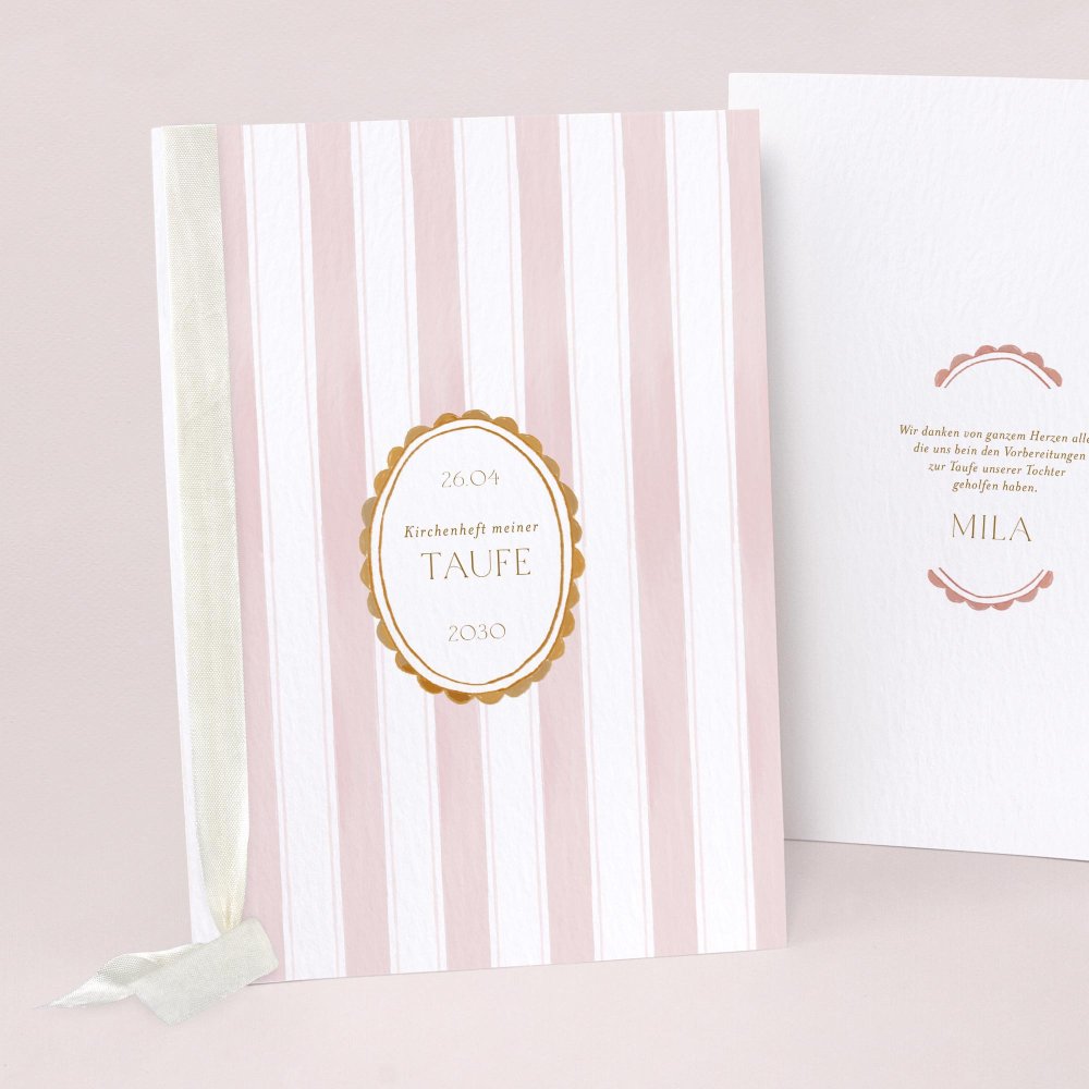 Fassen Sie die schönen Worte dieses feierlichen Anlasses in einen passenden Einband. Das Kirchenheft dient als Hülle für Ihre Texte zur kirchlichen Taufe, freien Taufe oder Willkommensfest. Drucken Sie Ihre Texte im A4-Format aus und legen Sie sie mittig gefalten in den Kirchenheft Einband. Besfestigen Sie das Ganze mit einem hübschen Band (als Accessoire bestellbar) und kreieren Sie so Ihr ganz persönliches Programmheft für die Zeremonie.