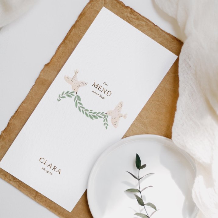 Tipp: Platzieren Sie die Menükarten entweder pro Sitzplatz oder pro Tisch und vervollständigen Sie so die Deko Ihrer Feier.