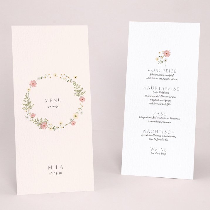 Tipp: Platzieren Sie die Menükarten entweder pro Sitzplatz oder pro Tisch und vervollständigen Sie so die Deko Ihrer Feier.