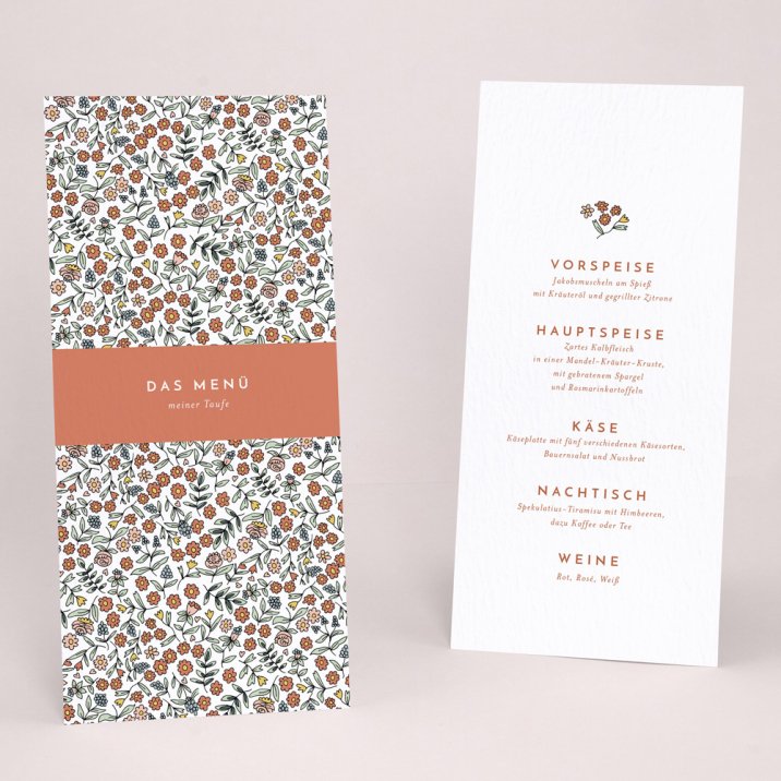 Tipp: Platzieren Sie die Menükarten entweder pro Sitzplatz oder pro Tisch und vervollständigen Sie so die Deko Ihrer Feier.