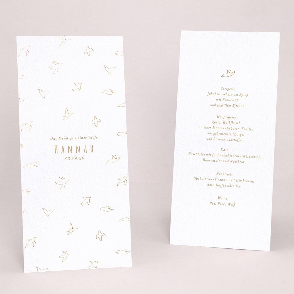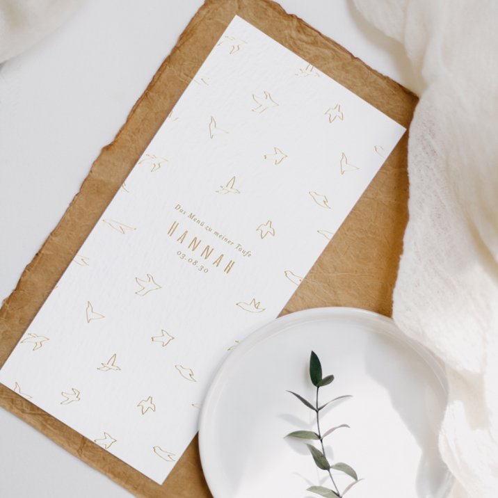 Tipp: Platzieren Sie die Menükarten entweder pro Sitzplatz oder pro Tisch und vervollständigen Sie so die Deko Ihrer Feier.