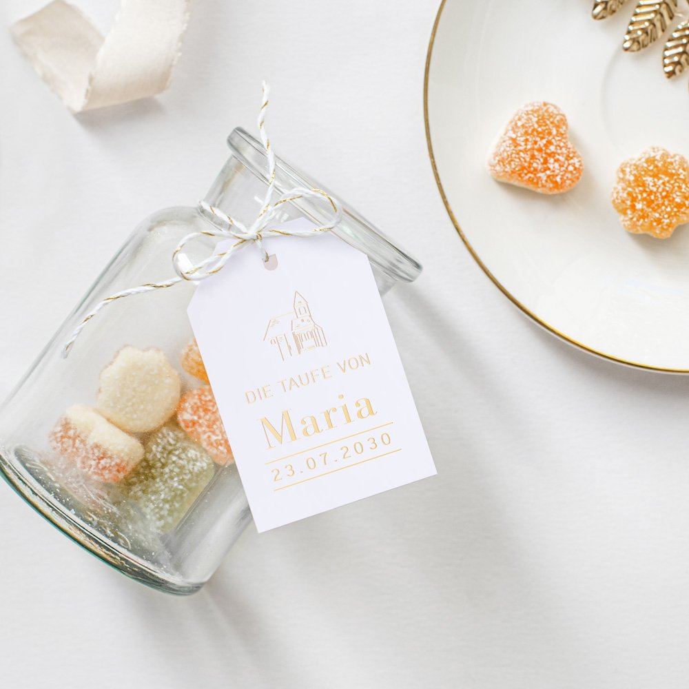 Dekorieren Sie kleine Geschenke für Ihre Taufgäste mit diesen personalisierbaren Geschenkanhängern. Die hübschen Anhänger eignen sich hervorragend, um kleine Präsente, Geschenkboxen und andere Aufmerksamkeiten zu personalisieren.