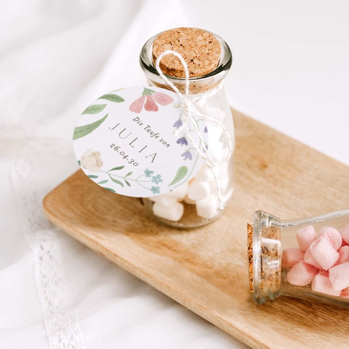 Dekorieren Sie kleine Geschenke für Ihre Taufgäste mit diesen personalisierbaren Geschenkanhängern. Die hübschen runden Anhänger eignen sich hervorragend, um kleine Präsente, Geschenkboxen und andere Aufmerksamkeiten zu personalisieren.