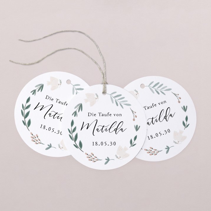 Dekorieren Sie kleine Geschenke für Ihre Taufgäste mit diesen personalisierbaren Geschenkanhängern. Die hübschen runden Anhänger eignen sich hervorragend, um kleine Präsente, Geschenkboxen und andere Aufmerksamkeiten zu personalisieren.