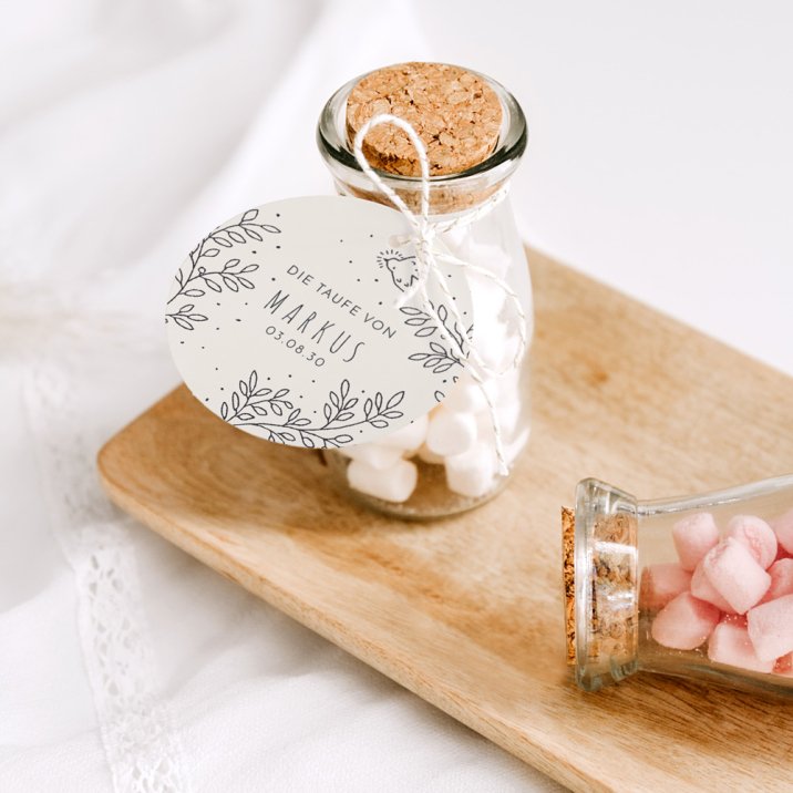Dekorieren Sie kleine Geschenke für Ihre Taufgäste mit diesen personalisierbaren Geschenkanhängern. Die hübschen runden Anhänger eignen sich hervorragend, um kleine Präsente, Geschenkboxen und andere Aufmerksamkeiten zu personalisieren.