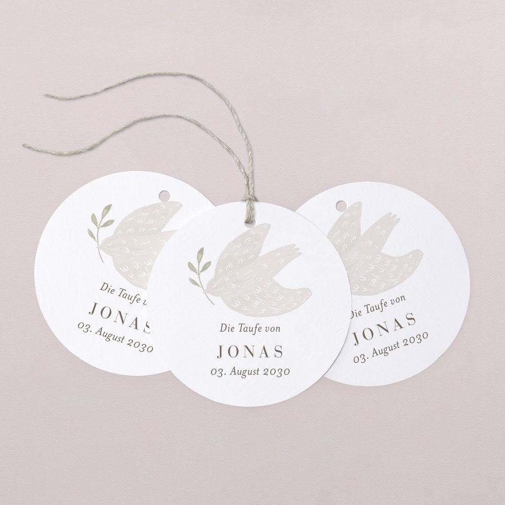 Dekorieren Sie kleine Geschenke für Ihre Taufgäste mit diesen personalisierbaren Geschenkanhängern. Die hübschen runden Anhänger eignen sich hervorragend, um kleine Präsente, Geschenkboxen und andere Aufmerksamkeiten zu personalisieren.